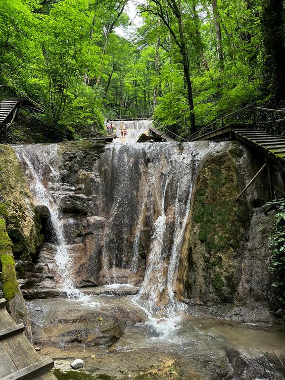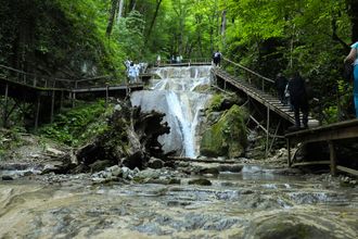 От аула Кичмай вас с ветерком повезут на вездеходах ГАЗ-66 по долине реки Шахе до урочища Джегош, где и низвергаются со скальных уступов великолепные водопады. Водопады на ручье Джегош — один из самых интересных и популярных экскурсионных объектов у гостей, приезжающих в город Сочи. Это природное явление носит названия «33 водопада» или «Долина легенд и водопадов». По деревянным лестницам вы будете подниматься вверх, осматривая водопад за водопадом – и так до 13. Есть возможность искупаться в каменных чашах, образованных падающей водой. Ручей Джегош правый приток реки Шахэ, имеет длину менее 2 км. Берет начало на склонах хребта Тюпюпх на горе Колокольня, высотой 872 м. над у.м. и питается подземными водами, а также открытыми притоками, которые пересыхают в летнее засушливое время. Водопады не пересыхают круглый год. Но в летнее время воды в них меньше, а в межсезонье и период дождей — больше.